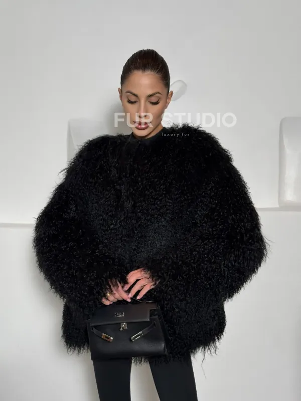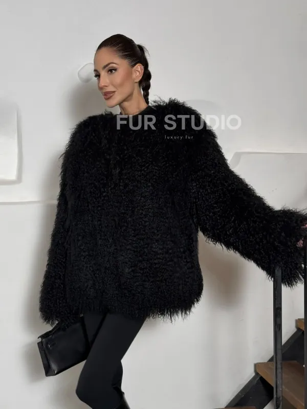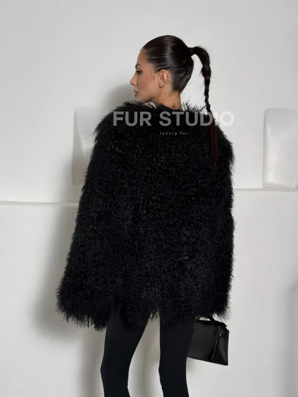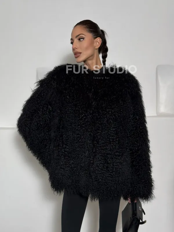 Черная шуба из меха ламы воротник шанель 101496