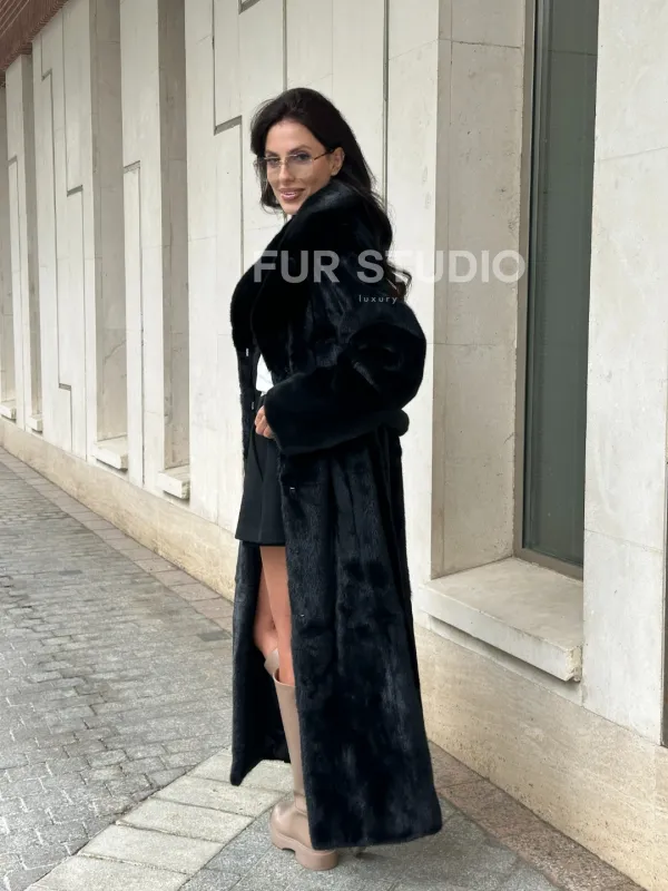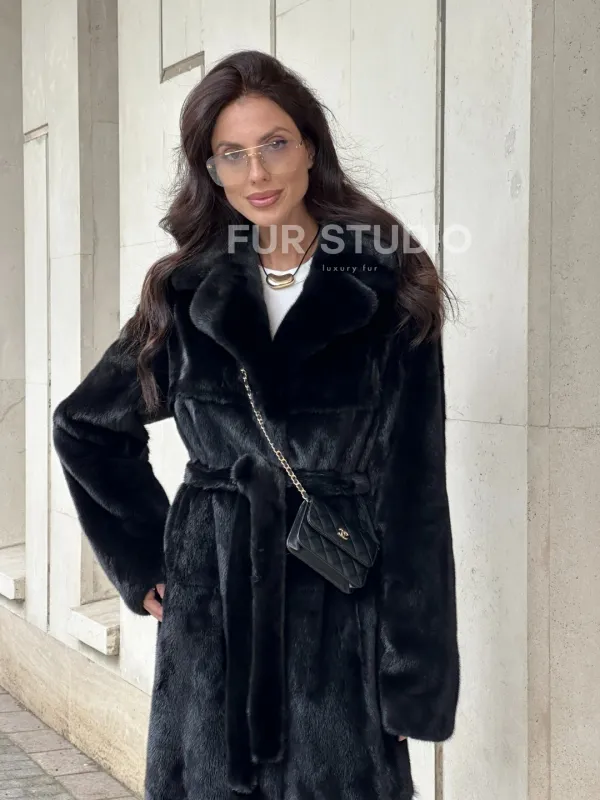 Черная норковая шуба NAFA MINK с поясом в пол 100933
