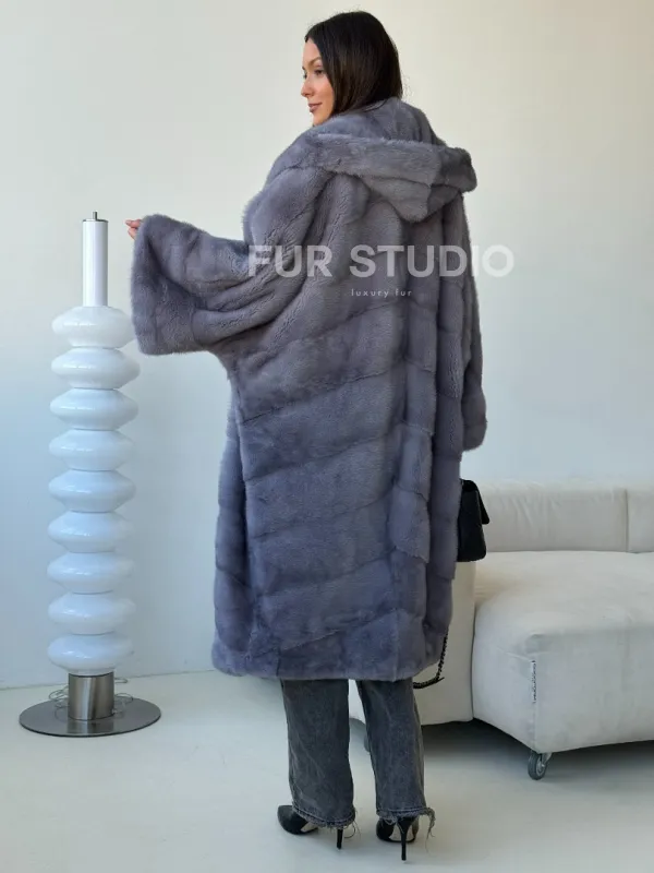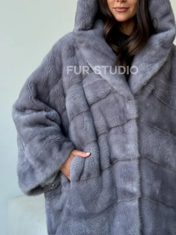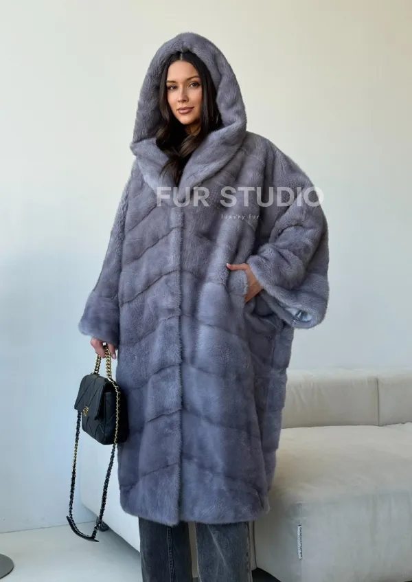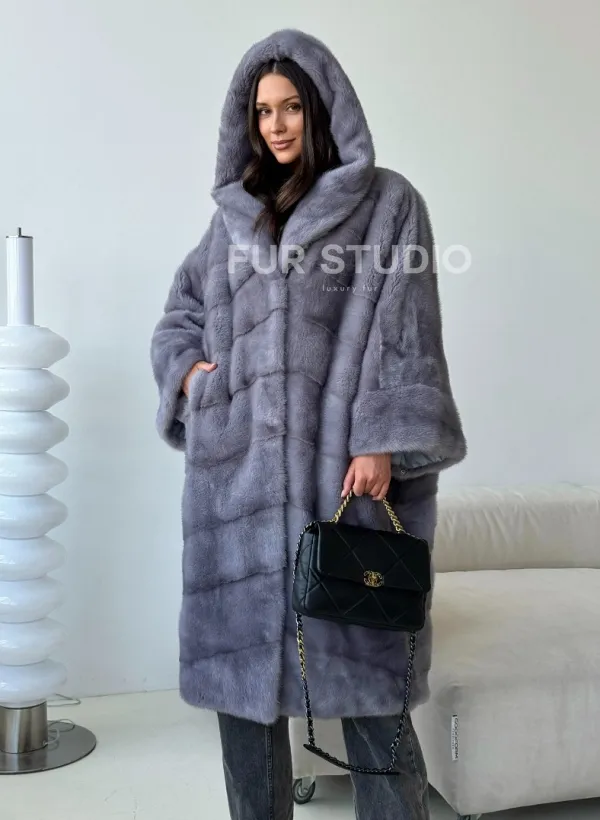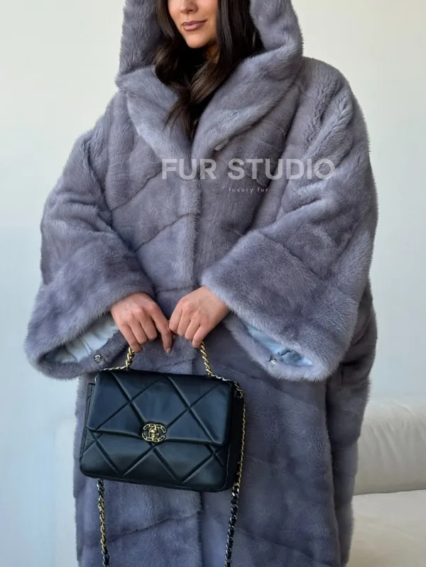 Голубая норковая шуба с капюшоном oversize 102501