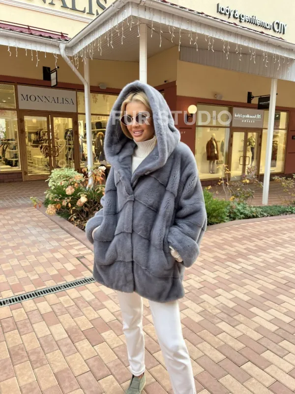 Удобные карманы сохранят тепло ручек. Прямой крой изделия не сковывает движений и скрывает недостатки. Модель удобна, если вы водите машину. Изделие сочетается с базовым гардеробом, подойдет под вечерний look. Добавьте к образу стильную сумочку и оригинальную обувь, вы готовы покорять мир. Купить норковое пончо с капюшоном в цвете графит могут женщины с изысканным вкусом.