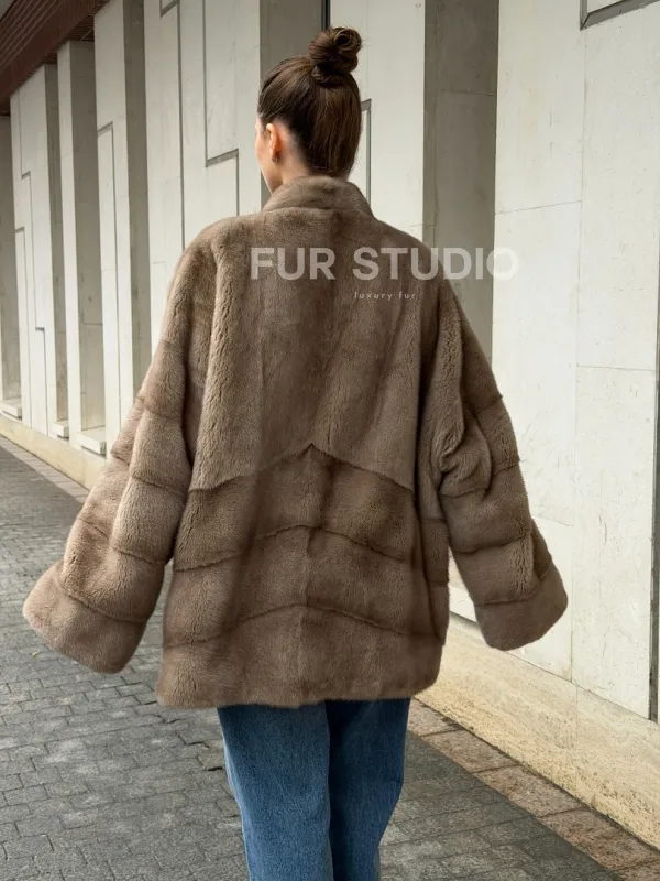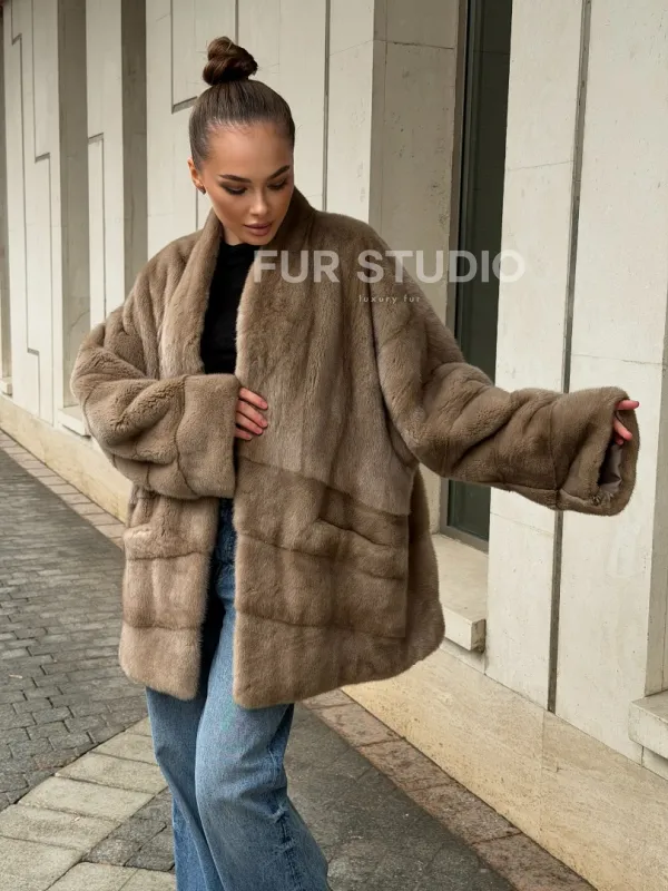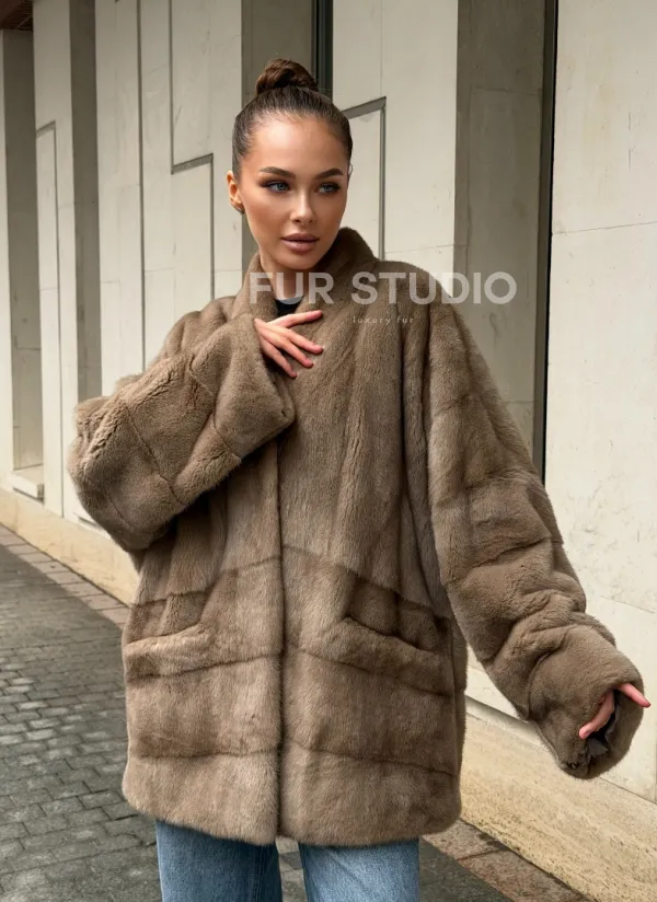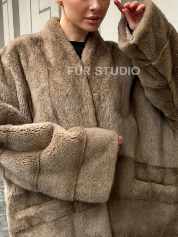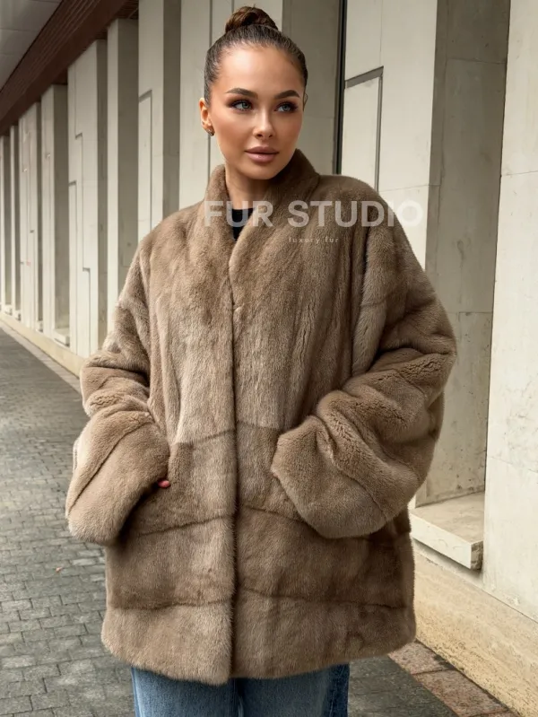 Норковый полушубок пастель V-образный воротник 102566