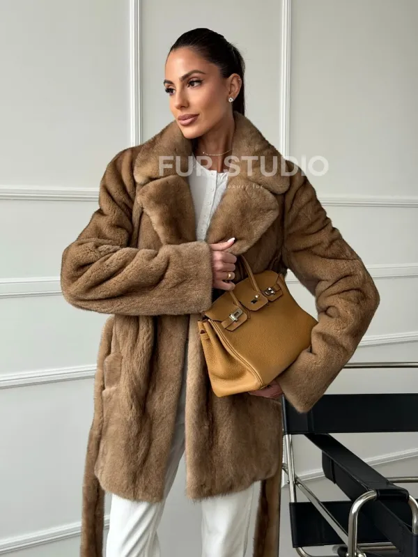 Полушубок норковый пастель с меховым поясом 102664