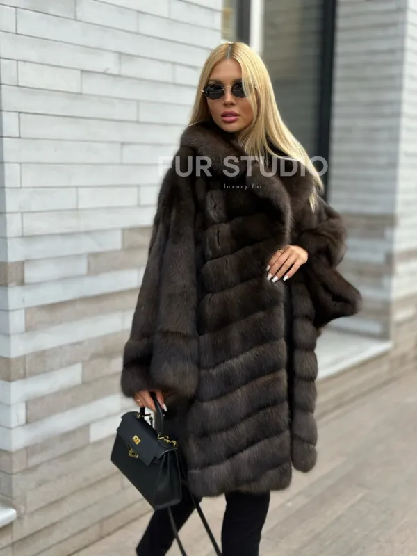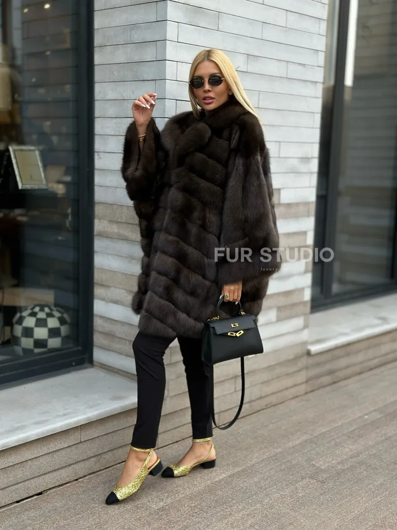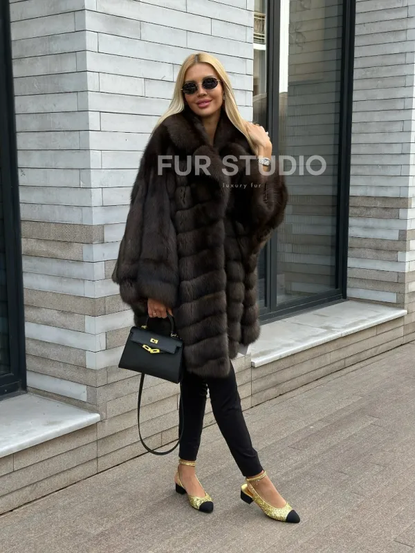 Укороченная шуба из натурального некрашеного меха баргузинского соболя нравится активным и уверенным в себе женщинам. Свободный крой с широкими рукавами не стесняет движений, а благодаря длине чуть выше колена в шубе удобно гулять по городу без страха испортить подол брызгами противогололедного реагента.