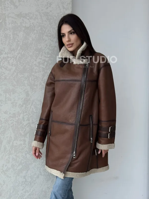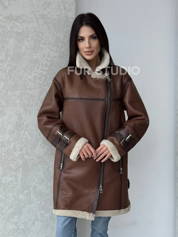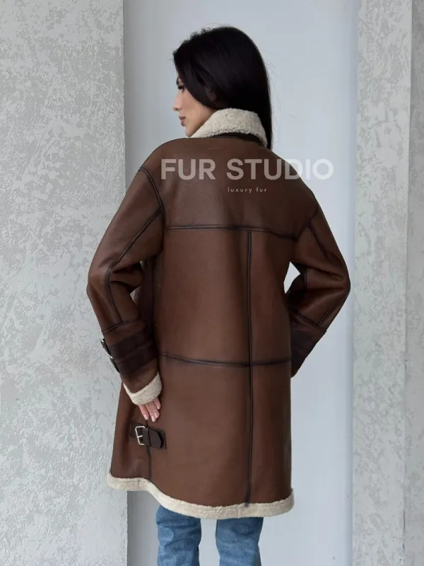 Удлиненная дубленка авиатор в коричневом цвете - винтажный стиль 100120