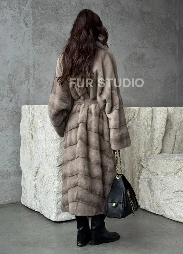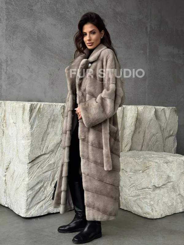 Удлинённая норковая шуба с поясом 102479