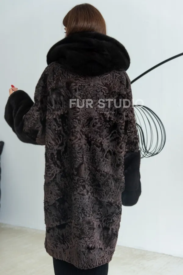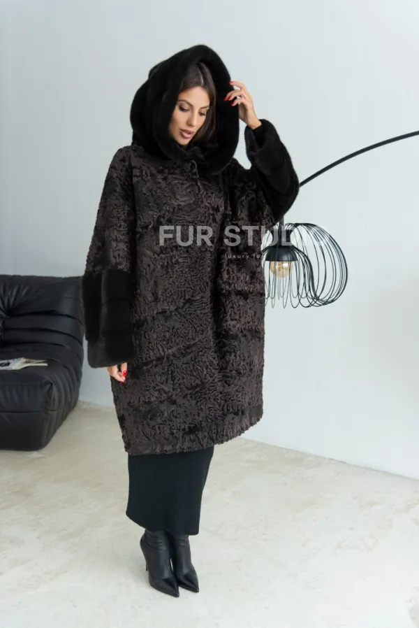 Уголь шуба из каракульчи и норки с капюшоном 100628